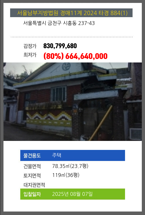 | 건물면적 | 78.35㎡ (23.7평) | 채무자 | 이** | 최저가 | (80%) 664,640,000 |