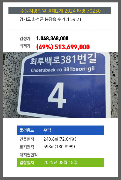 | 건물면적 | 240.8㎡ (72.84평) | 채무자 | 김** | 최저가 | (49%) 513,699,000 |