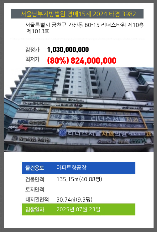 본건은 서울특별시 금천구 가산동 60-15 리더스타워 제10층 제1013호
