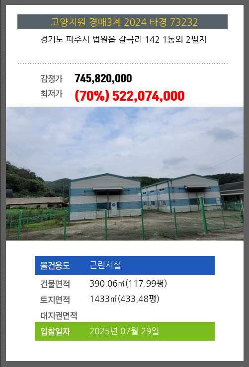 | 소재지 | [지번] 경기도 파주시 법원읍 갈곡리 142 1동외 2필지 [도로명 주소] 경기도 파주시 법원읍 칡울안길 22 1동 |