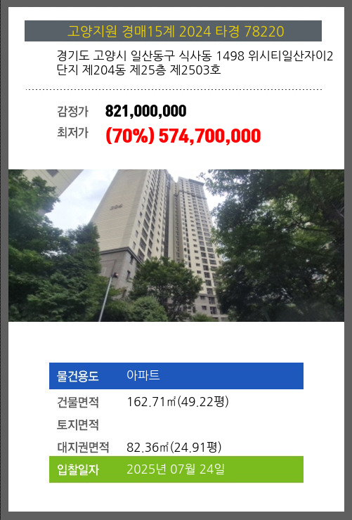 본건은 경기도 고양시 일산동구 식사동 1498 위시티일산자이2단지 제204동 제25층 제2503호