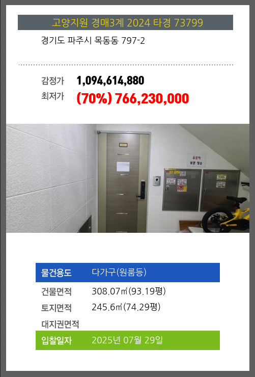 | 건물면적 | 308.07㎡ (93.19평) | 채무자 | 장** | 최저가 | (70%) 766,230,000 |
