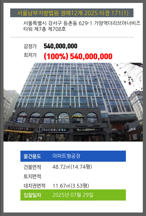 본건은 서울특별시 강서구 등촌동 629-1 가양역더리브아너비즈타워 제7층 제708호