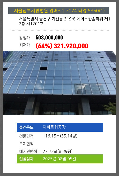 본건은 서울특별시 금천구 가산동 319-8 에이스한솔타워 제12층 제1201호