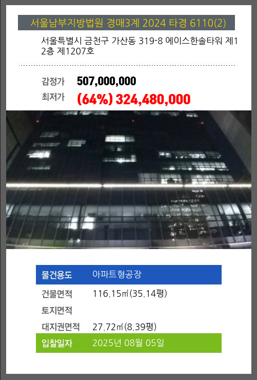 본건은 서울특별시 금천구 가산동 319-8 에이스한솔타워 제12층 제1207호