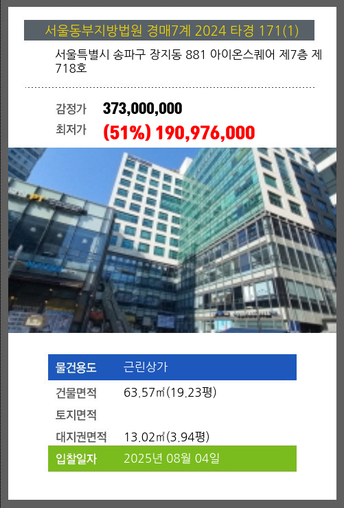 송파상가경매 송파구 장지동 881 아이온스퀘어 제7층 제718호 №2024 타경 171(1)