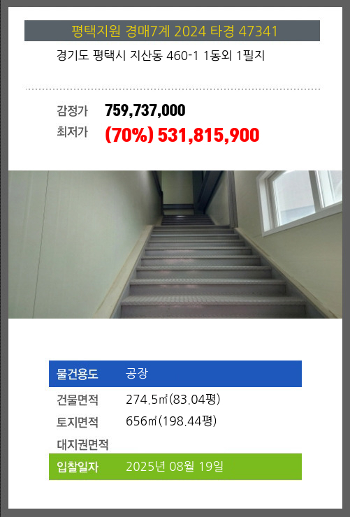 | 소재지 | [지번] 경기도 평택시 지산동 460-1 1동외 1필지 [도로명 주소] 경기도 평택시 우곡길 28 1동 |