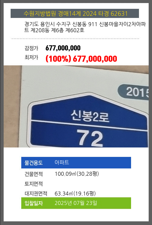 본건은 경기도 용인시 수지구 신봉동 911 신봉마을자이2차아파트 제208동 제6층 제602호