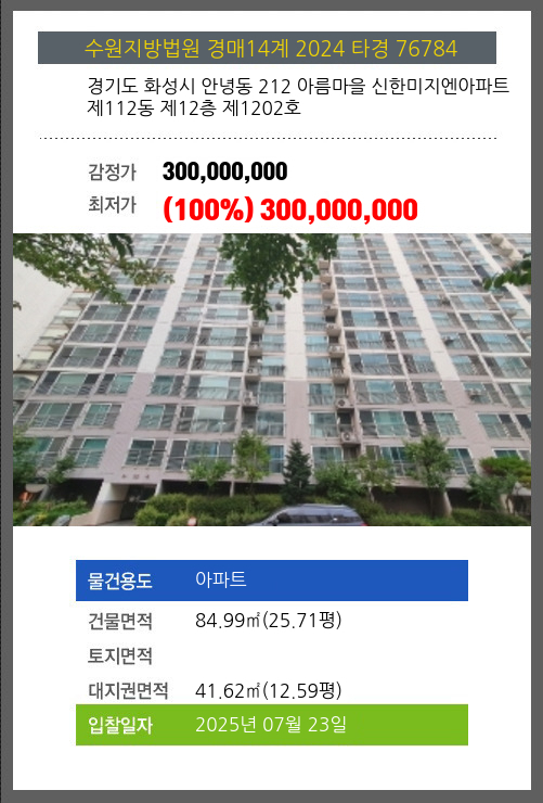 | 건물면적 | 84.99㎡ (25.71평) | 채무자 | 박** | 최저가 | (100%) 300,000,000 |
