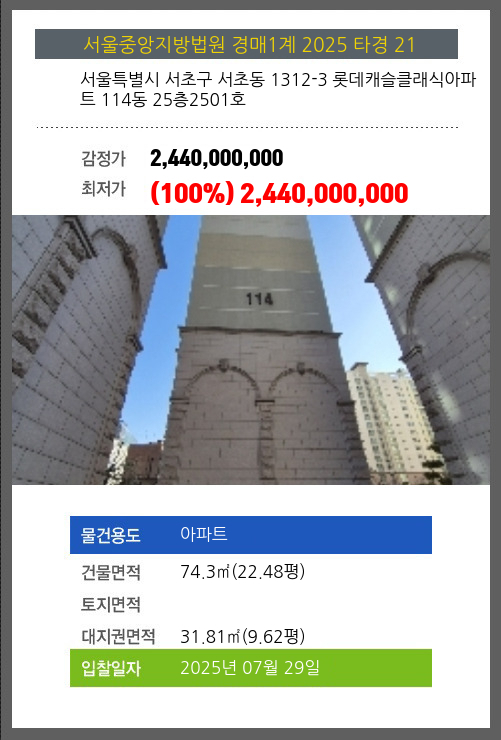 본건은 서울특별시 서초구 서초동 1312-3 롯데캐슬클래식아파트 114동 25층2501호