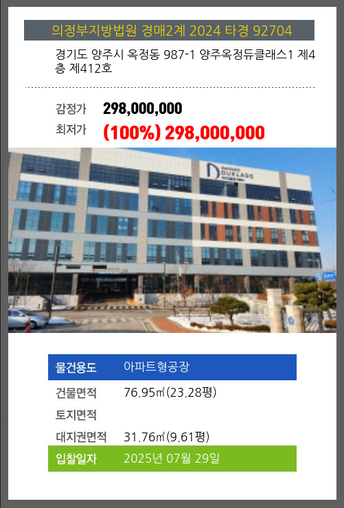 | 소재지 | [지번] 경기도 양주시 옥정동 987-1 양주옥정듀클래스1 제4층 제412호 [도로명 주소] 경기도 양주시 화합로1710번길 12 양주옥정듀클래스1 제4층 제412호 |