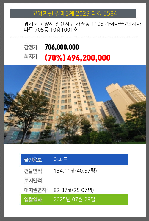 고양아파트경매 고양시 일산서구 가좌동 1105 가좌마을7단지아파트 705동 10층1001호 №2023 타경 5584