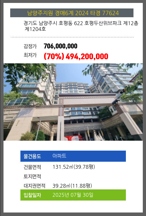 남양주아파트경매 남양주시 호평동 622 호평두산위브파크 제12층 제1204호 №2024 타경 77624