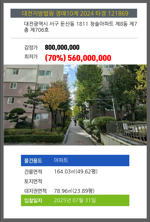 본건은 대전광역시 서구 둔산동 1811 청솔아파트 제8동 제7층 제706호