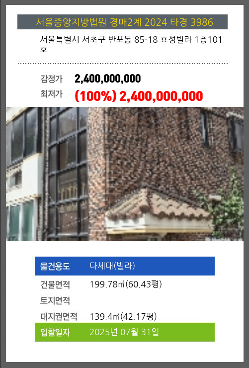 | 대지권 | 139.4㎡ (42.17평) | 소유자 | 조** | 보증금 | (10%) 240,000,000 |