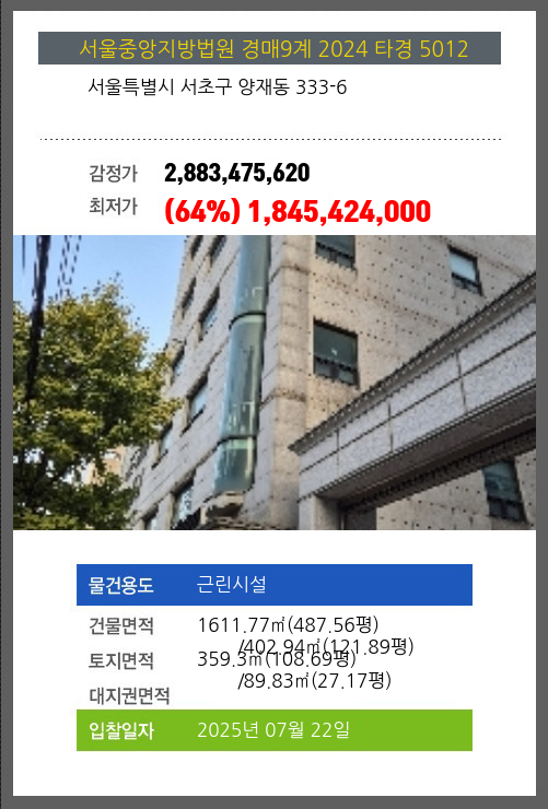 | 건물면적 | 전체:1611.77㎡ (487.56평) 매각지분:402.94㎡ (121.89평) |