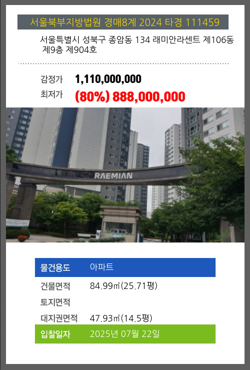 본건은 서울특별시 성북구 종암동 134 래미안라센트 제106동 제9층 제904호
