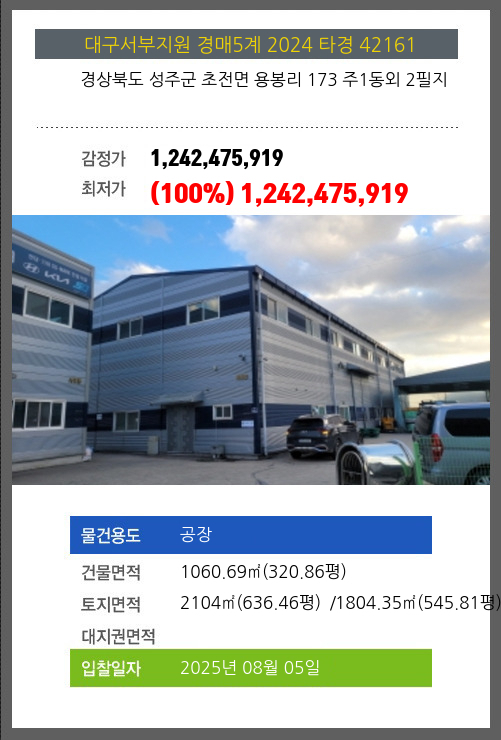 | 용도 | 공장 | 채권자 | 유** | 감정가 | 1,242,475,919 |
