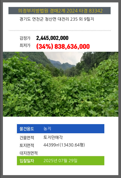 | 토지면적 | 44399㎡ (13430.64평) | 소유자 | 박** | 보증금 | (10%) 83,863,600 |