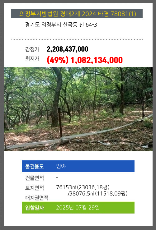 | 용도 | 임야 | 채권자 | ㈜** | 감정가 | 2,208,437,000 |