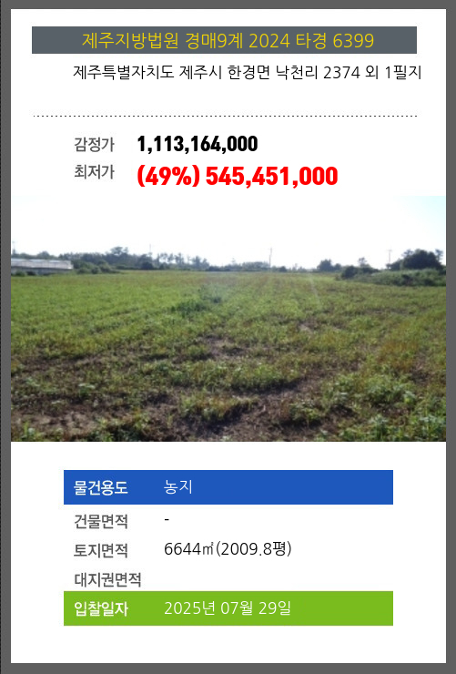 | 소재지 | [지번] 제주특별자치도 제주시 한경면 낙천리 2374 외 1필지 | ||||