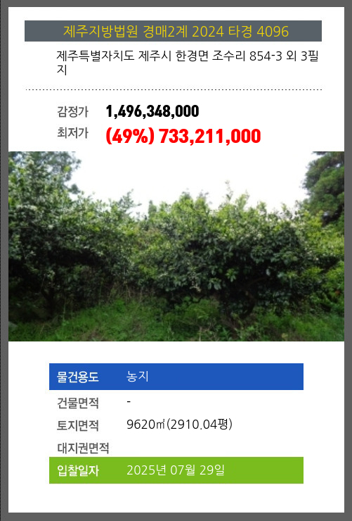 제주농지경매 제주시 한경면 조수리 854-3 외 3필지 №2024 타경 4096