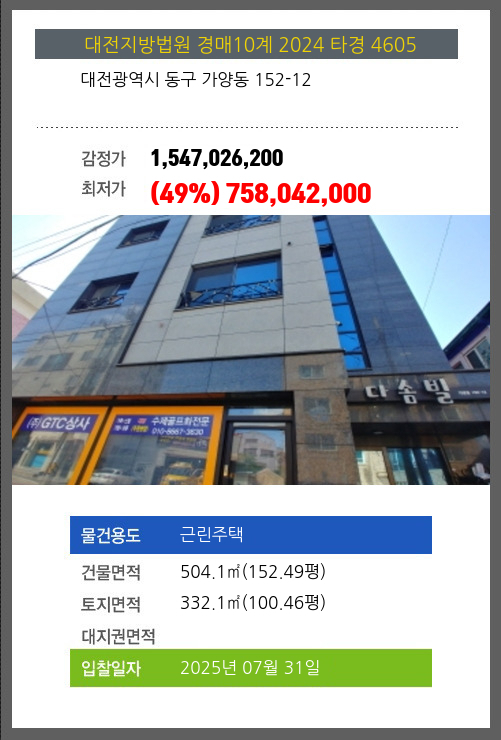 건물면적 504.1㎡ (152.49평) 채무자 안** 최저가 (49%) 758,042,000