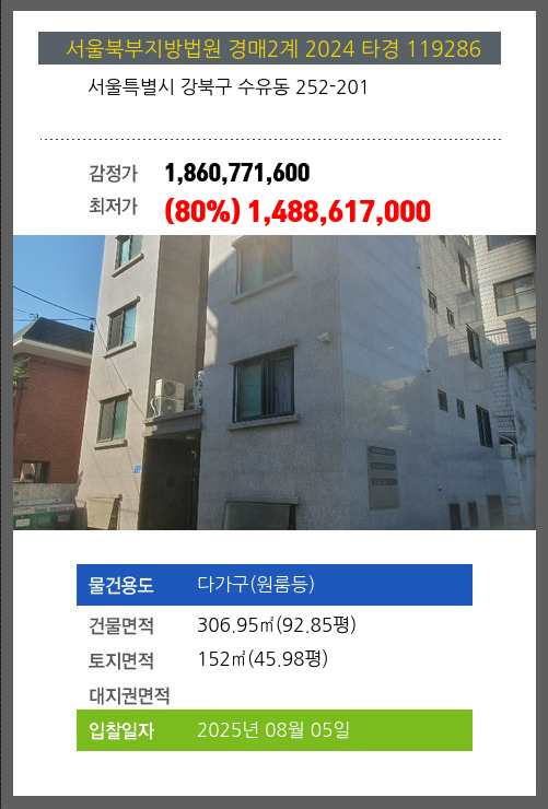 건물면적 306.95㎡ (92.85평) 채무자 서** 최저가 (80%) 1,488,617,000