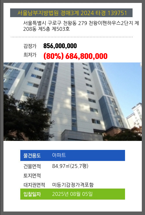 본건은 서울특별시 구로구 천왕동 279 천왕이펜하우스2단지 제208동 제5층 제503호