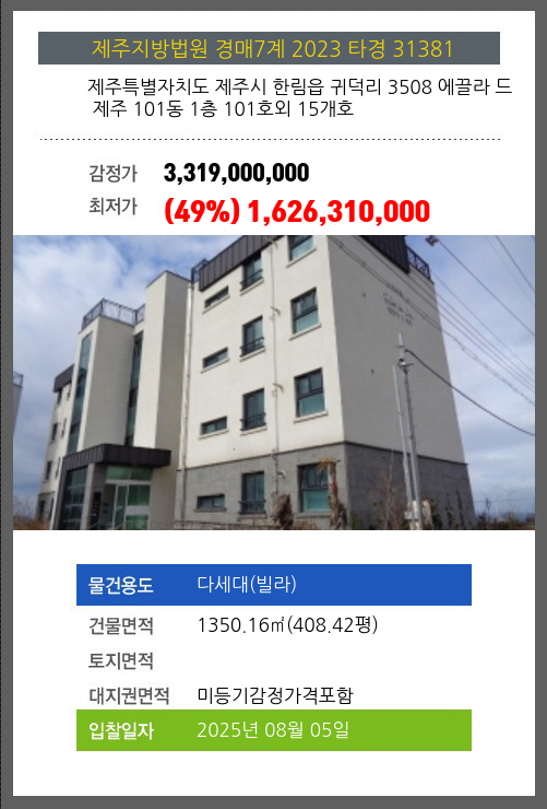 제주빌라경매 제주시 한림읍 귀덕리 3508 에끌라 드 제주 101동 1층 101호외 15개호 №2023 타경 31381