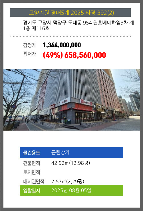 | 건물면적 | 42.92㎡ (12.98평) | 채무자 | 오** | 최저가 | (49%) 658,560,000 |