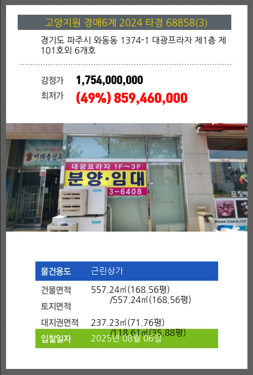 파주상가경매 파주시 와동동 1374-1 대광프라자 제1층 제101호외 6개호 №2024 타경 68858(3)