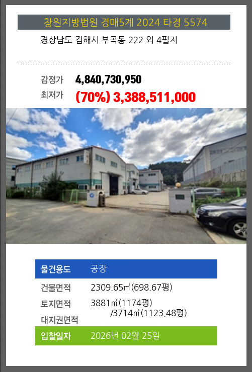 | 용도 | 공장 | 채권자 | 더** | 감정가 | 4,840,730,950 |