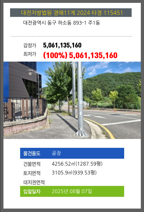| 용도 | 공장 | 채권자 | 김**외1명 | 감정가 | 5,061,135,160 |