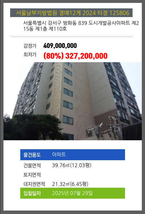 본건은 서울특별시 강서구 방화동 839 도시개발공사아파트 제215동 제1층 제110호