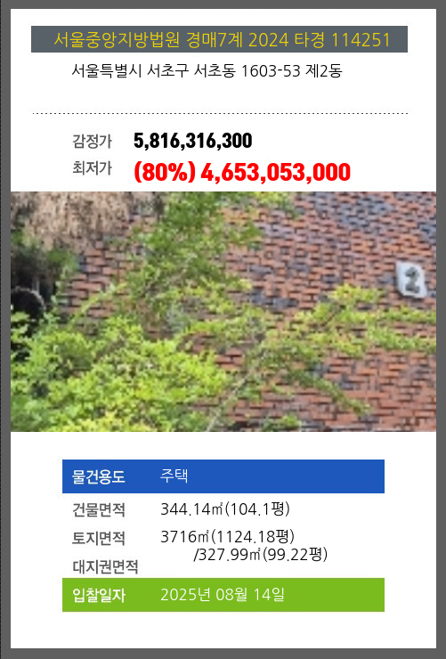 | 건물면적 | 344.14㎡ (104.1평) | 채무자 | 성** | 최저가 | (80%) 4,653,053,000 |