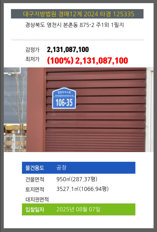 영천공장경매 영천시 본촌동 875-2 주1외 1필지 №2024 타경 125335