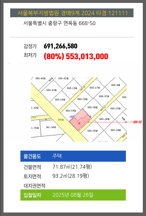 중랑주택경매 중랑구 면목동 668-50 №2024 타경 121111