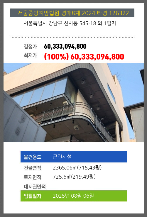 | 용도 | 근린시설 | 채권자 | 케** | 감정가 | 60,333,094,800 |