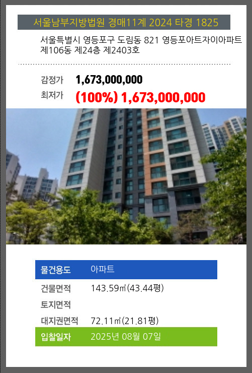 영등포아파트경매 영등포구 도림동 821 영등포아트자이아파트 제106동 제24층 제2403호 №2024 타경 1825