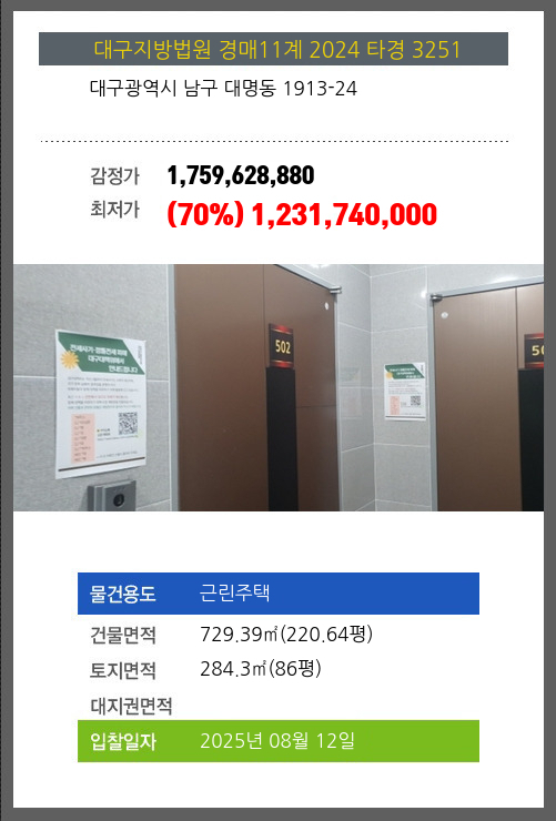 | 용도 | 근린주택 | 채권자 | 봉** | 감정가 | 1,759,628,880 |