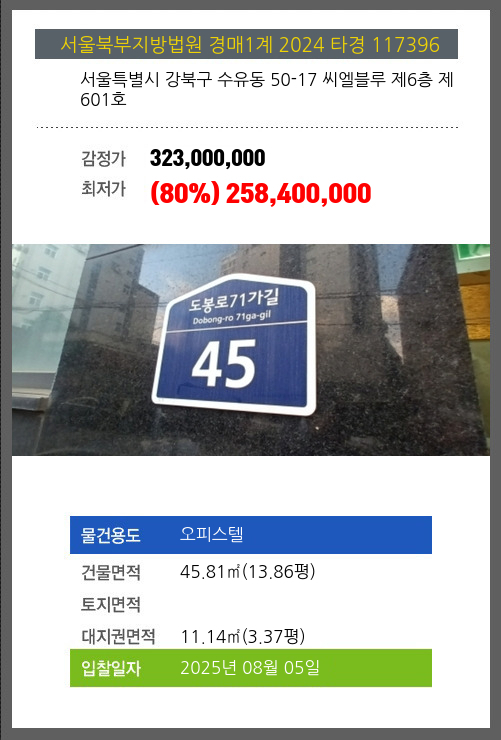 강북오피스텔경매 강북구 수유동 50-17 씨엘블루 제6층 제601호 №2024 타경 117396