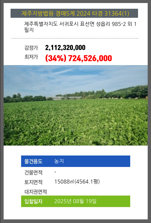 | 용도 | 농지 | 채권자 | 제** | 감정가 | 2,112,320,000 |