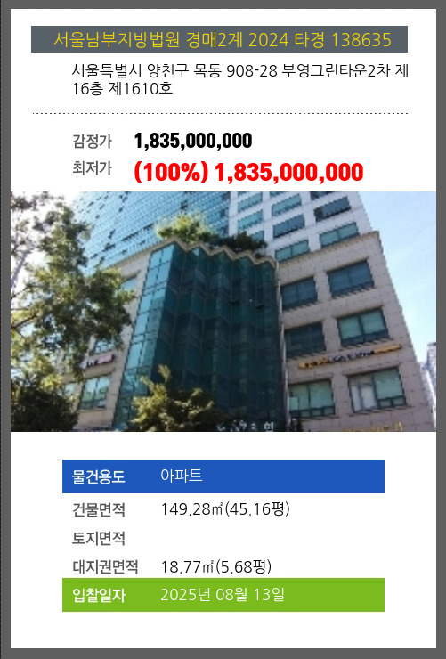 본건은 서울특별시 양천구 목동 908-28 부영그린타운2차 제16층 제1610호