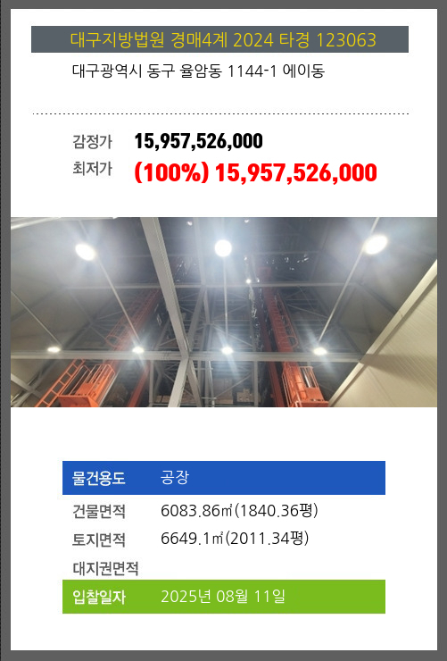 | 용도 | 공장 | 채권자 | 중** | 감정가 | 15,957,526,000 |