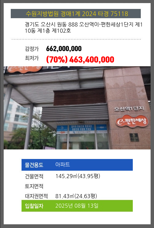오산아파트경매 오산시 원동 888 오산역이-편한세상1단지 제110동 제1층 제102호 №2024 타경 75118