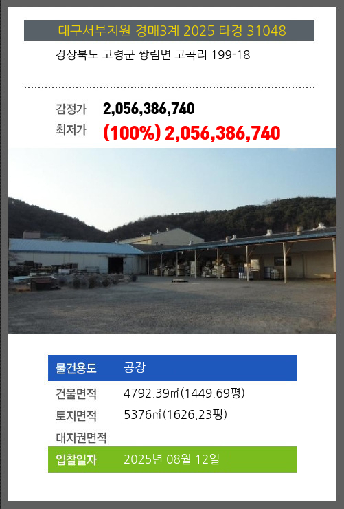 | 용도 | 공장 | 채권자 | 효**외1명 | 감정가 | 2,056,386,740 |