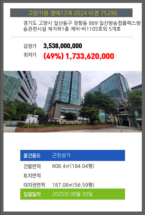 본건은 경기도 고양시 일산동구 장항동 869 일산방송컴플렉스방송관련시설 제지하1층 제비-비1105호외 5개호