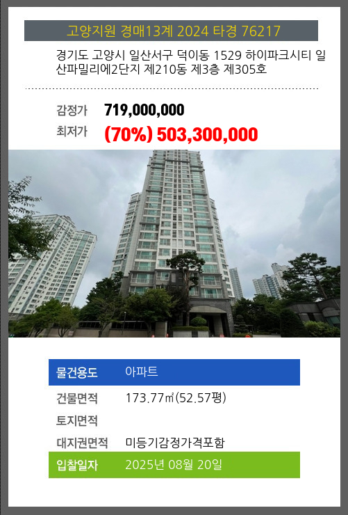 | 건물면적 | 173.77㎡ (52.57평) | 채무자 | 알** | 최저가 | (70%) 503,300,000 |