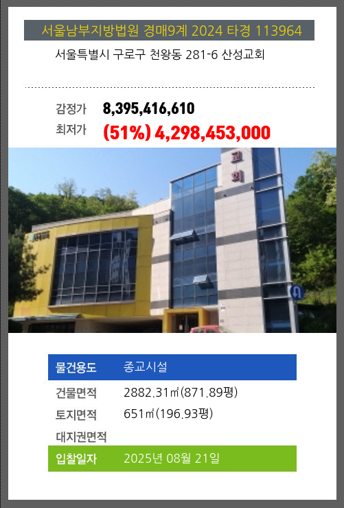 | 용도 | 종교시설 | 채권자 | 구** | 감정가 | 8,395,416,610 |